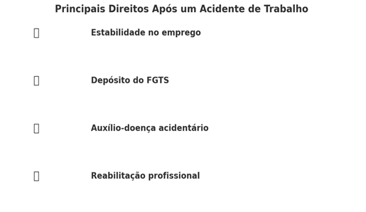 Se você sofreu um acidente de trabalho, saiba que tem uma série de direitos garantidos pela CLT e pela Previdência Social. Veja os principais: